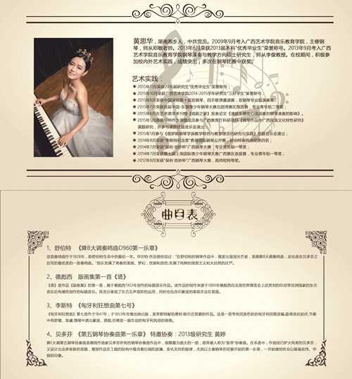 黄思华硕士毕业钢琴独奏音乐会 来源: 作者:何昆 发布时间:2015-11-16 23:27:35 浏览次数: 次 【字体:小 大】 指导老师:李俊教授 时间:2015年11月17日晚8点整 地点:广西艺术学院音乐厅 分享到: 【打印正文】