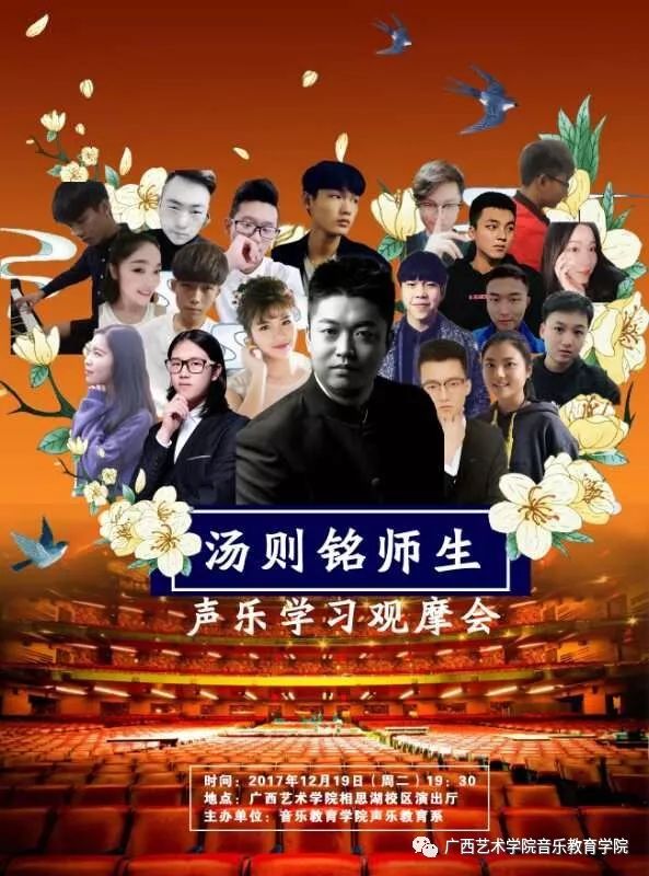 兹定于2017年12月19日(星期二)19:30在广西艺术学院相思湖校区演出厅举办“汤则铭师生声乐学习观摩会”。