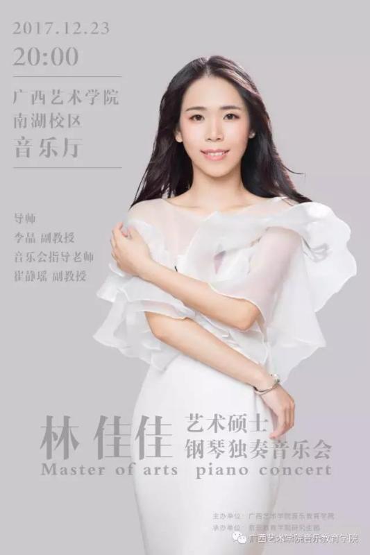 FUN88乐天使在线登录林佳佳艺术硕士钢琴独奏音乐会即将于2017年12月23日20:00在广西艺术学院南湖校区音乐厅精彩上演,欢迎广大师生前往观看指导!