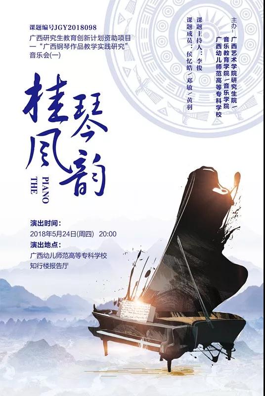 2018广西研究生教育创新计划资助项目《广西钢琴作品教学实践研究》音乐会即将于2018年5月24日 20:00 广西幼儿师范高等专科学校知行楼报告厅;2018年5月25日 20:00广西民族大学西校区音乐厅精彩上演,欢迎广大师生前往观看指导!