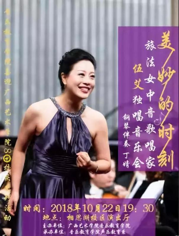 喜迎80校庆系列活动——《美妙的时刻》伍艾独唱音乐会即将于2018年10月22日19:30在广西艺术学院相思湖校区演出厅精彩上演,欢迎广大师生前往观看指导!