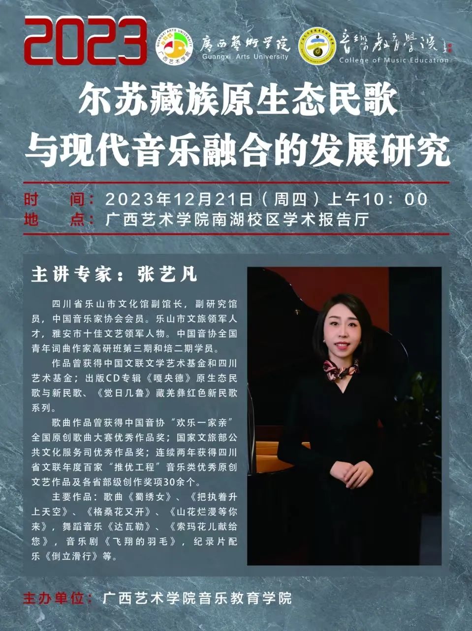 【2023学术活动预告】尔苏藏族原生态民歌与现代音乐融合的发展研究 来源: 作者: 发布时间:2023-12-20 12:40:56 浏览次数: 次 【字体:小 大】 尔苏藏族原生态民歌与现代音乐融合的发展研究主讲专家:张艺凡时间:2023年12月21日(周四)上午10:00地点:广西艺术学院南湖校区学术报告厅尔苏藏族原生态民歌展演节目单 1.觉里曼姆表演者:苏正琼、王丽梦、洛桑妮玛、王勇 2.勒思泽(洗簸箕)表演者:苏正琼、王丽梦、唐伟欣 3.萨里昂多曼表演者:姜英、洛绒、山丹梅 4.情歌表演者:洛桑妮玛、唐伟欣 5.阿瓦尕(蜜蜂报信)表演者:王丽梦、唐伟欣 6.哭嫁歌表演者:苏正琼、王丽梦 7.母亲表演者:苏正琼、唐伟欣 8.瓦曼依哇表演者:全体女同志 9.喔呀哩勒表演者:苏正琼、姜英、吴迎霞、骆平 10.劳动歌表演者:洛桑妮玛、王勇、姜英、洛绒 11.迎客歌表演者:姜英、洛绒、山丹梅新民歌展演节目单 1.环山鸡节歌(改编:陈川)表演者:洛桑妮玛、王勇 2.祈祷(改编:韩兆云)表演者:洛桑妮玛 3.格桑花又开(作词:刘柏峻 作曲:张艺凡)表演者:洛桑妮玛、王勇、洛绒 4.心手相牵(作词:刘柏峻、山丹梅 作曲:张艺凡)表演者:王丽梦、洛绒 5.阿妈的勒思泽(改编:张艺凡)表演者:王丽梦、唐伟欣、洛绒、姜英 终审:戴丽霞 初审:赵海生 编辑:窦晟元 文案:FUN88乐天使在线登录“蒲公英”记者团 分享到: 【打印正文】